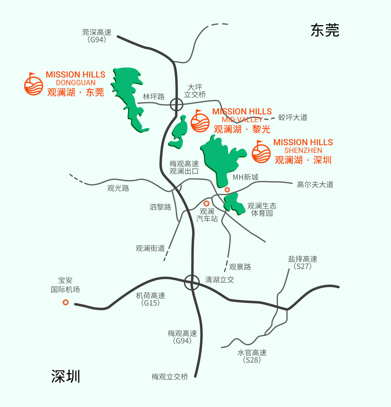 观澜湖位于深圳市梅观高速、莞深高速和机荷高速交叉处无论从哪个方向来,都可以轻而易举地到达。