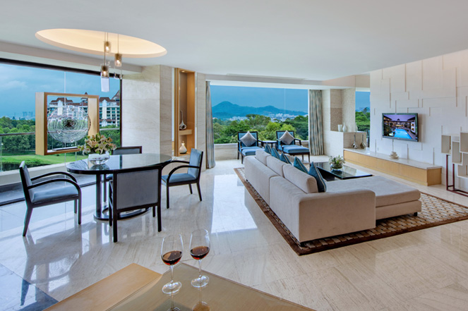 座落在高尔夫球场中央的五星级度假酒店,酒店坐拥国家5A级旅游景区,汇聚12个高尔夫界传奇人物设计的标准十八洞球场,天然风光景致收于一室。酒店包含高级豪华客房、高级行政客房、高级尊尚客房、高级豪华家庭套房、高级尊尚套房、高级尊尚家庭套房、总统套房、儿童主题房等主题房,尽览高尔夫绿茵及湖光山色。酒店还配有多间设施齐全、温馨别致的宠物主题房,满足游客携宠出行的需求。
