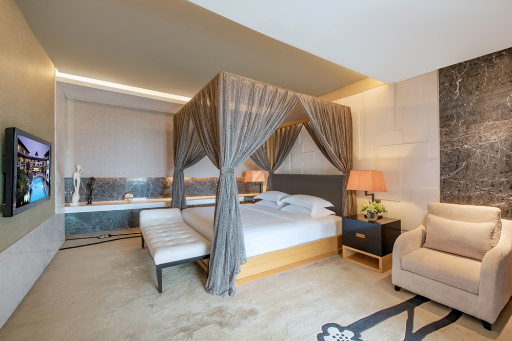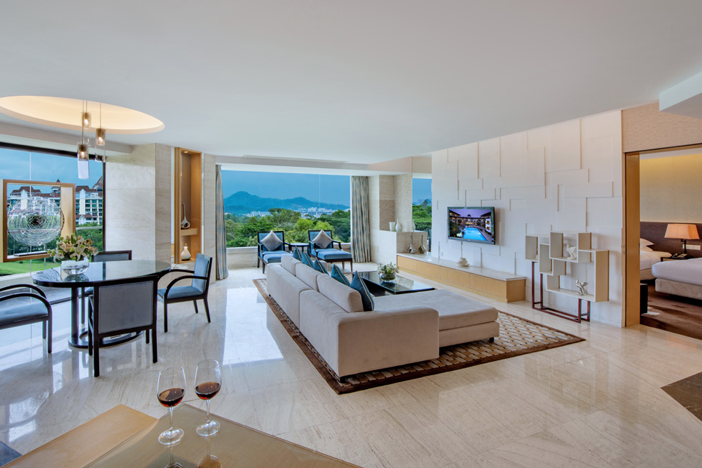 高级尊尚套房面积约175平方米。特别悉心设计的高级尊尚套房,室内设计瑰丽堂皇,设有宽敞的客厅和饭厅,两间睡房、两间浴室、衣帽间、厨房及酒水吧