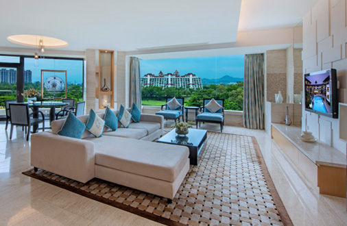总统套房位于酒店最高楼层,房间面积约355平方米。柔和灯光与宽敞空间感相映配衬。总统套房美轮美奂,设施豪华,设有客厅、饭厅、两间睡房、衣帽间(连化妆间)、双人按摩房、两间浴室、干蒸房、两间客用洗手间、办公间、厨房及酒水吧,堪称尊贵住宿的典范。视野开阔,可享受球场景致。