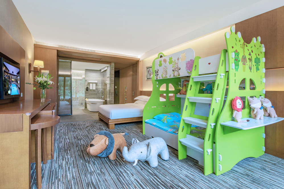 高级豪华亲子家庭套房,面积为100平方米,专为家庭客人设计,配备有两双床和一张大床,一如家居生活,小朋友有一个特色的欢乐空间的同时,也便于父母的照顾。