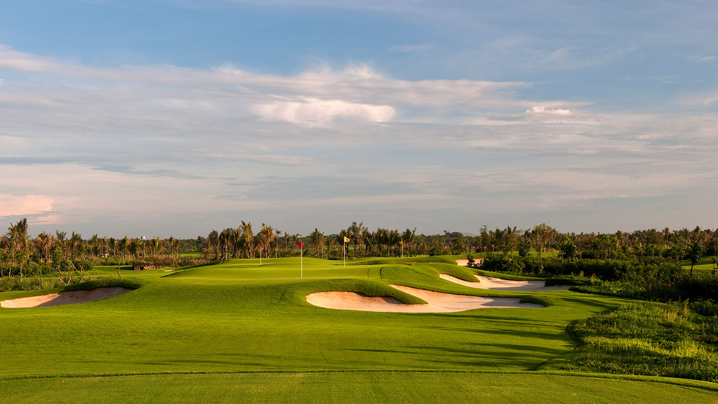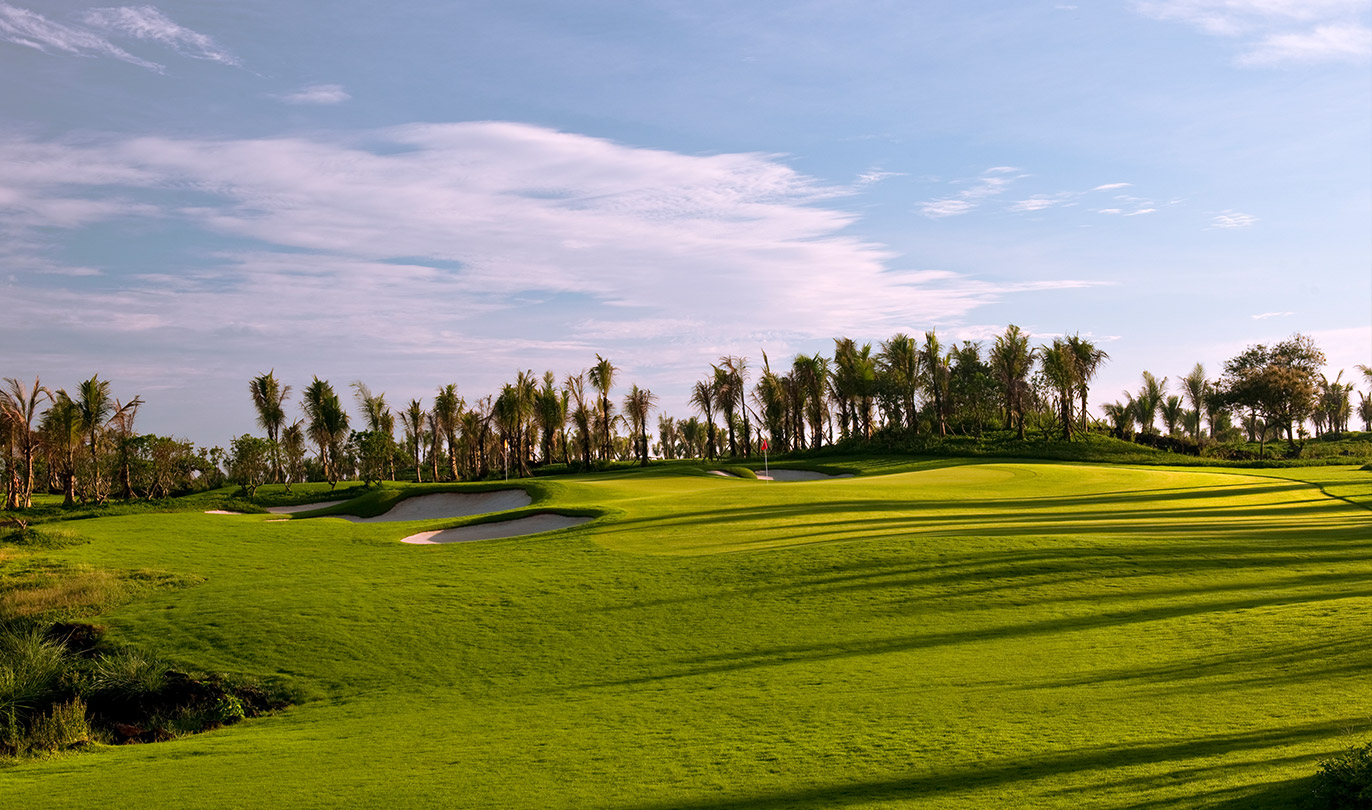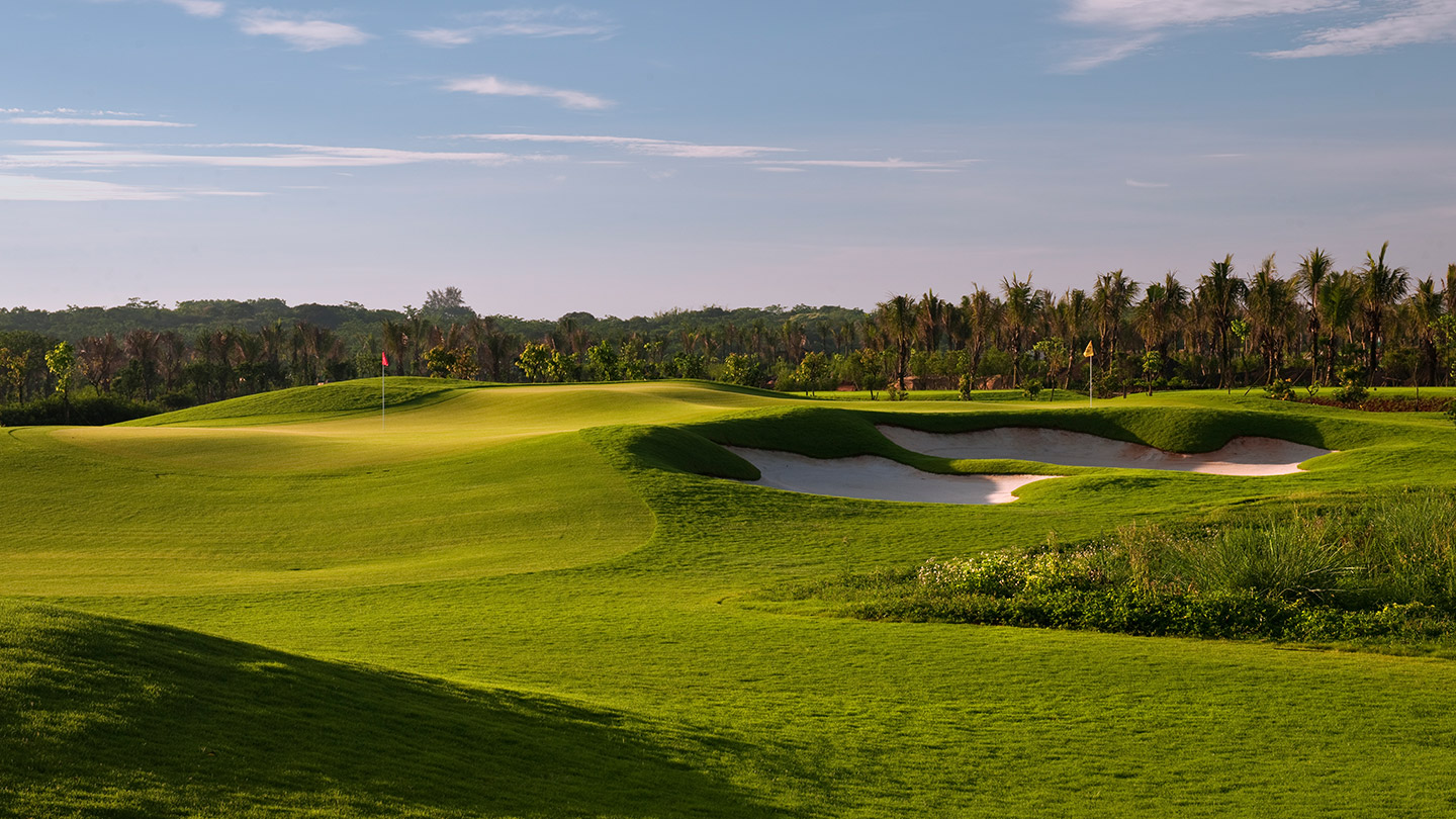 这18个3杆洞组成的球场集合了独特而清晰的风格特点,每个果岭设有两个洞杯。这样的果岭设计是为了提供两种选择:一个更简单、位置更容易估计,另一个则要困难得多。植物园式的园林风格给人一种很享受的布满各色树木和鲜花的氛围环境,与海口的蓝天和清新空气相得益彰。所有水平级别的球手都可以在这座球场找到适合他们的心情和技术的乐趣。家庭成员、初学者以及职业球手,都能够在此打球或练习,度过愉快美好的一天。