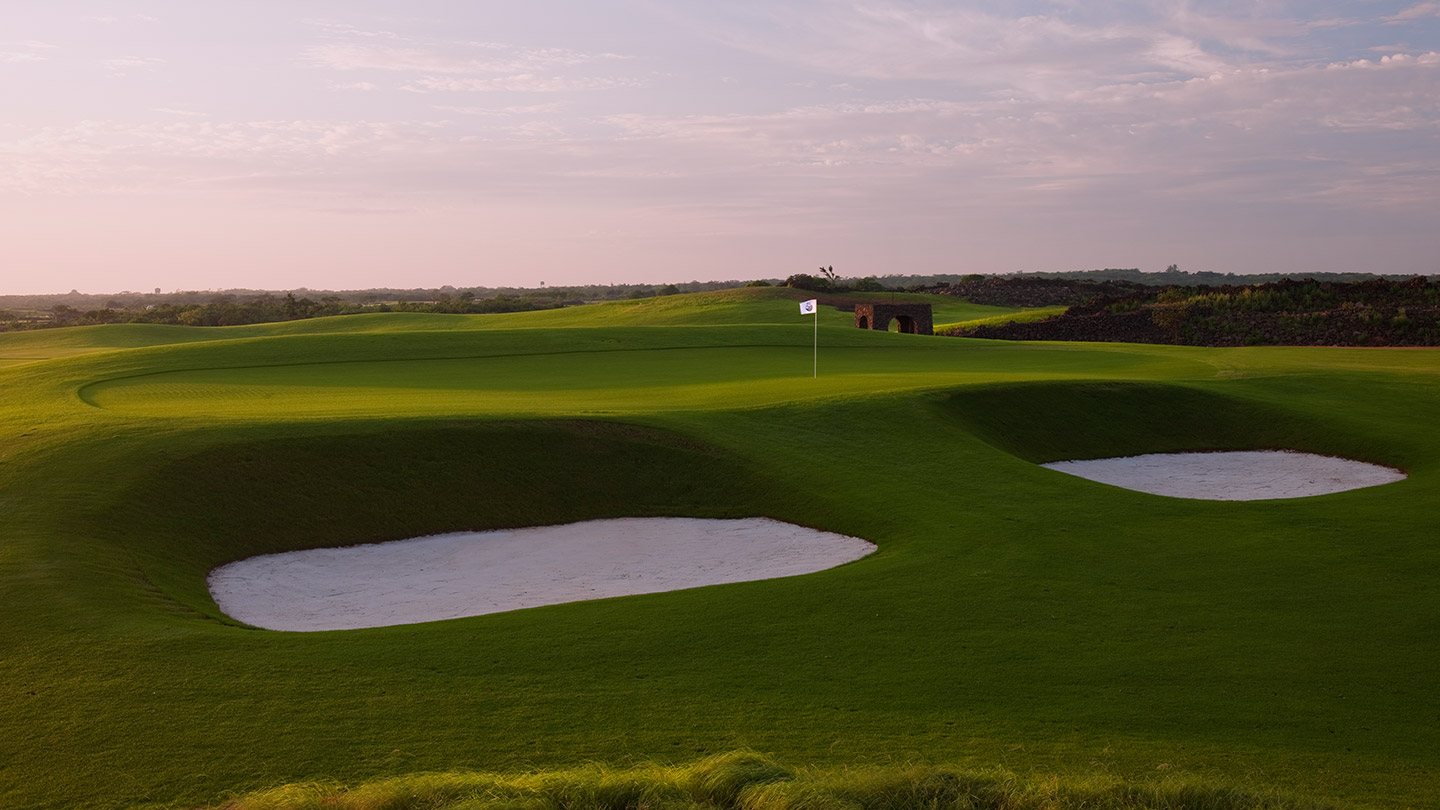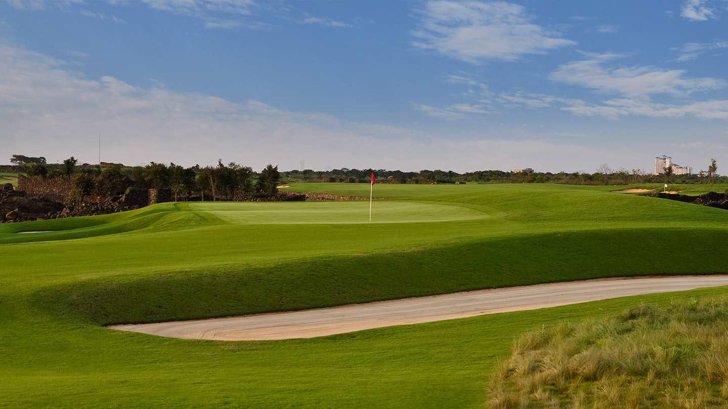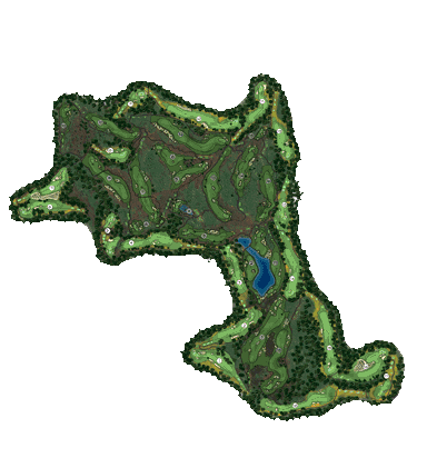 根据美国东部的美国公开赛使用球场的特征,将一些沙坑和球道的轮廓线都左侧几何形状,再加上"教堂椅"沙坑和草面沙坑,还有原生草的融入给人一种辽阔的草原感觉,再加上偶尔出现的树木。果岭面积都比较大,增加了推杆难度。