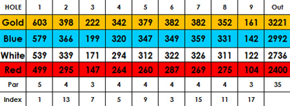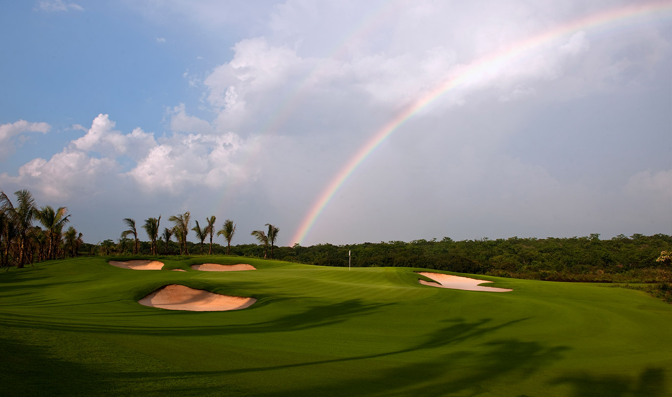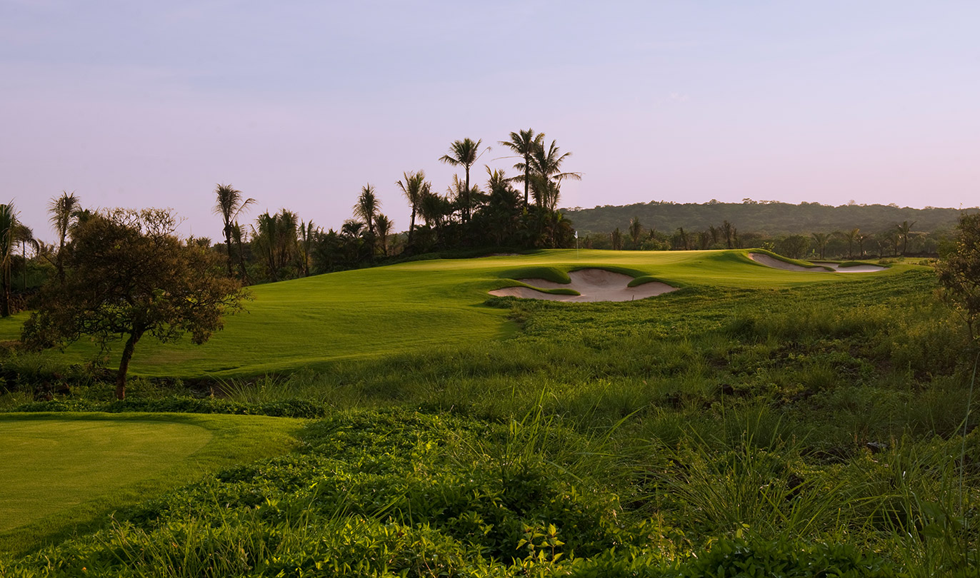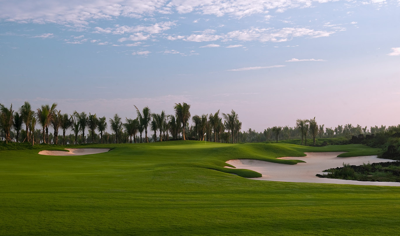 以茂密的棕榈树丛为骨干的绿化区,为这块易于上手的球场定下了美丽景观型球场的基调,设计风格颇具现代性。宽大的球道中以沙坑作为间隔停顿,果岭区域被山包环绕,中间的推杆面造型遵循现代信条。大量的开花灌木和地被植物组成的景观区鲜艳而生动,在整个球场中营造出支配性的印象。而棕榈树群则有效地遮挡了阳光,给人以舒适放松。